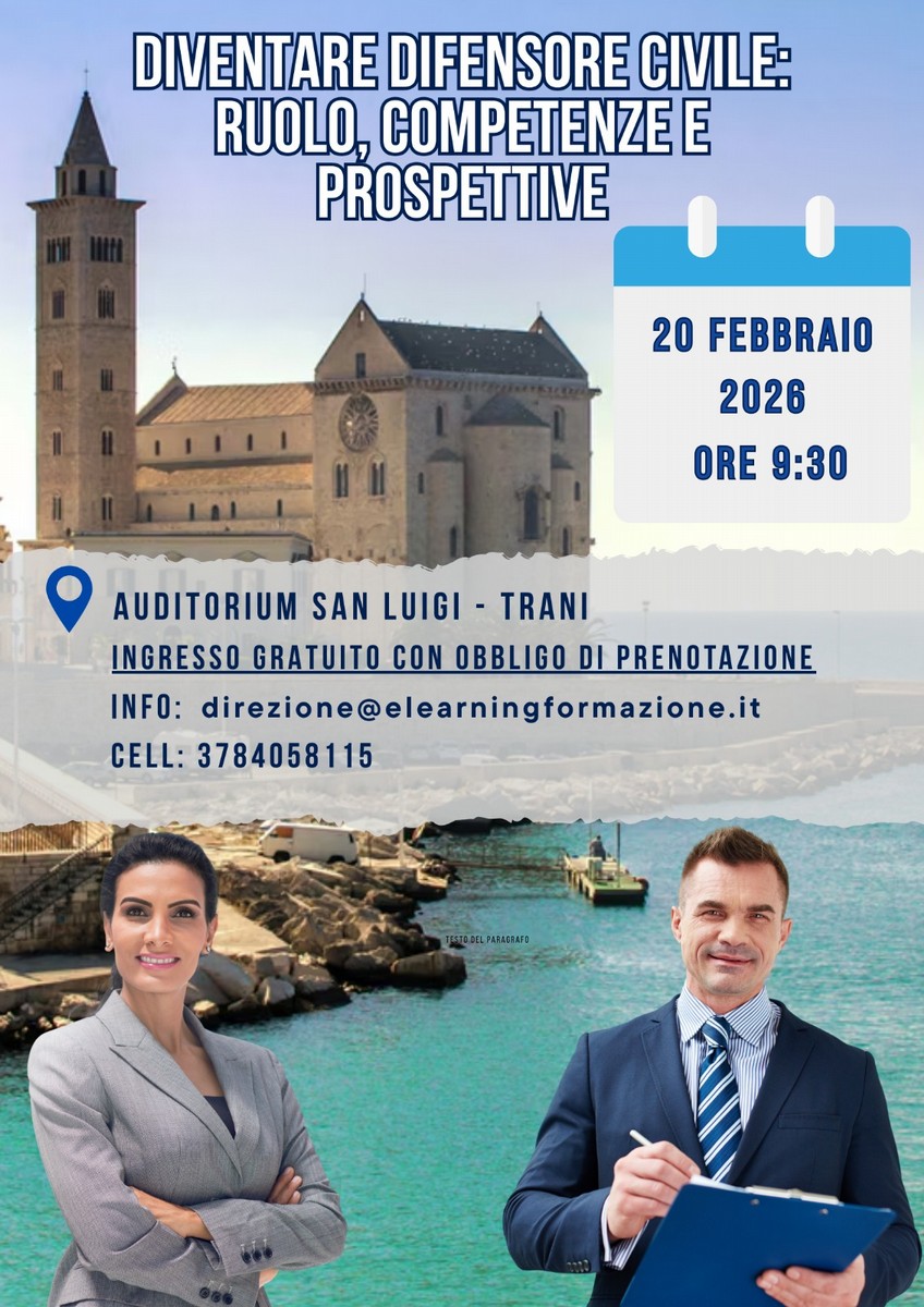 Venerdì 20 febbraio, dalle ore 9:00 alle ore 13:00, presso l'Auditorium San Luigi di Trani, si terrà il convegno intitolato "Diventare Difensore Civile: ruolo, competenze e prospettive", nel quale verrà ufficialmente presentata la nuova figura professionale, riconosciuta ai sensi della Legge n. 4/2013, che disciplina le professioni non organizzate in ordini o collegi.