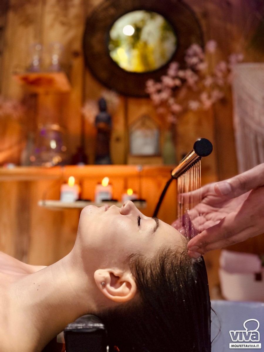 Spicca nell'"Hair Spa" il "massaggio Shirodhara", ossia un rituale ayurvedico che calma i pensieri e distende i sensi attraverso un olio caldo profumato che cola dolcemente sulla fronte. Il tutto viene eseguito su un lettino massaggiante che funziona grazie alla nuova tecnologia nella sua duplice ramificazione, ad aria e a ultrasuoni. Si propagano, infatti, delle vibrazioni anche grazie ai bassi della musica che fuoriescono dal lavatesta e si diffondono in tutto il corpo. Al lettino, inoltre, si aggiungono i massaggi su cranio, viso e spalle.