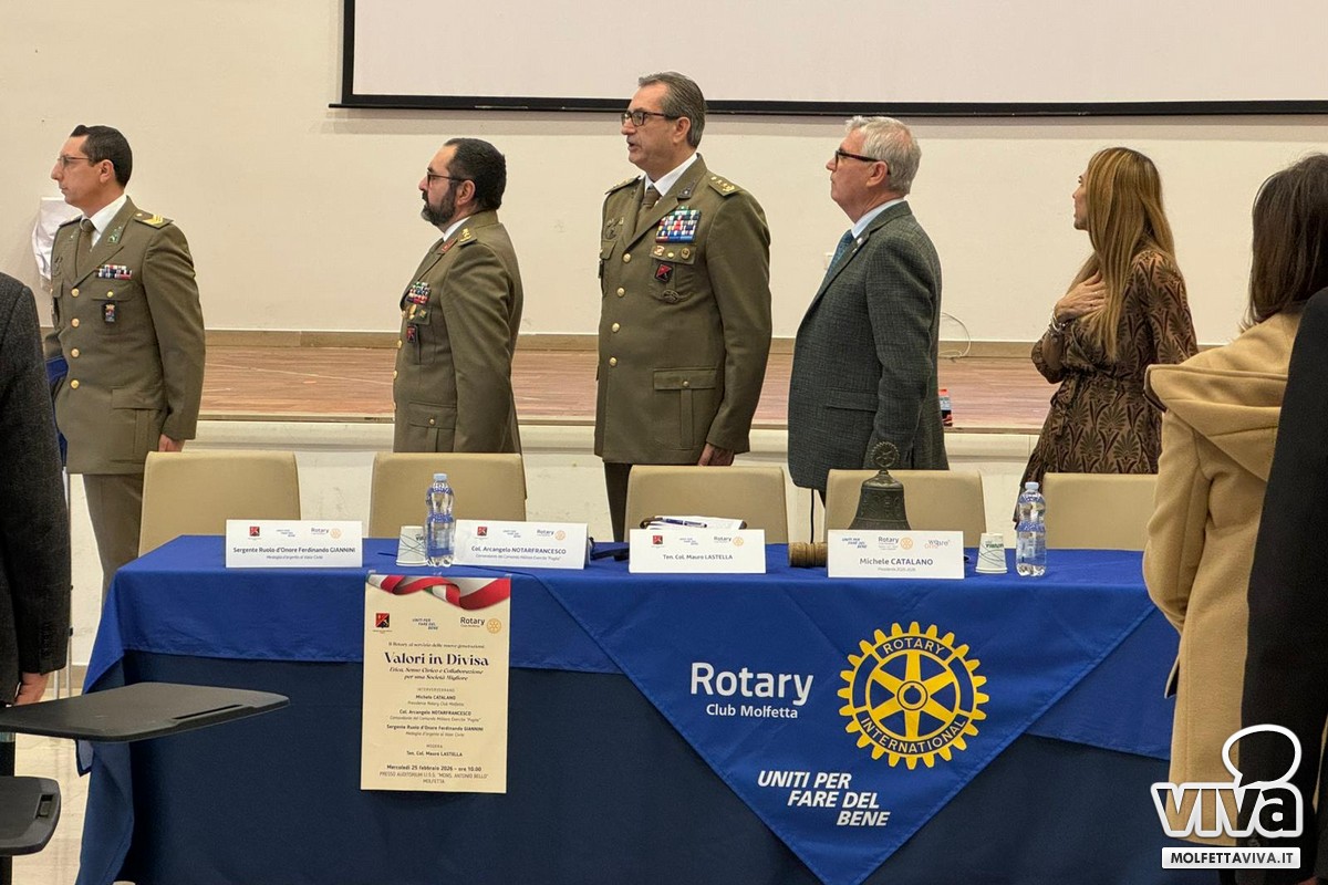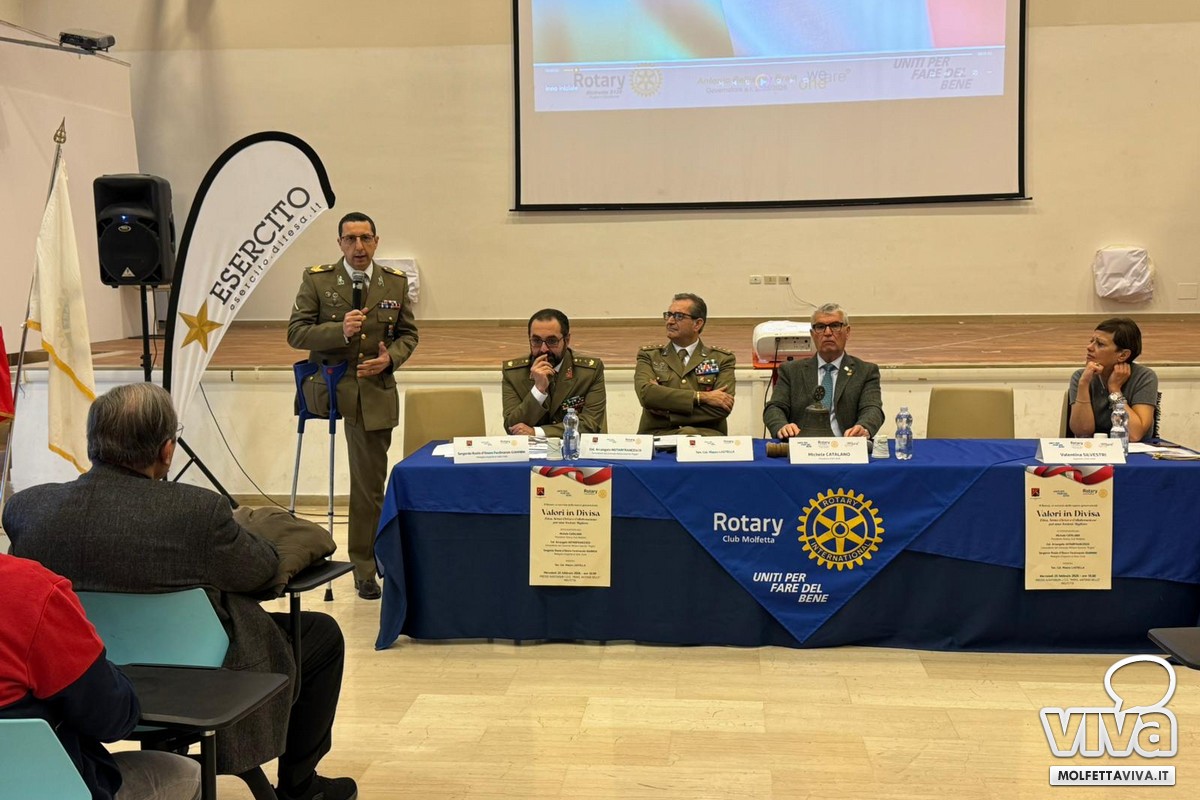 È con il consueto "tocco della campana" che si è aperto "Valori in divisa", l'incontro promosso dal Rotary Club, tenutosi ieri mattina all'Istituto "Mons. Antonio Bello" di Molfetta. Etica, senso civico e valori per la costruzione di un futuro migliore sono state le tematiche centrali dell'evento che ha beneficiato contributi d'eccezione: al tavolo dei relatori, infatti, sedevano il Colonnello Arcangelo Notafrancesco, Comandante del Comando Militare Esercito "Puglia", e il Tenente Colonnello Mauro Lastella.