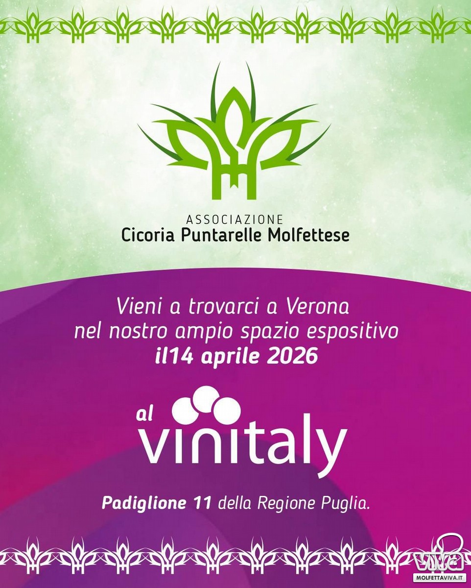 Per la prima volta, l'Associazione per la Valorizzazione e la Promozione della Cicoria Puntarelle Molfettese farà il suo debutto al Vinitaly, la celebre fiera internazionale del vino che ogni anno attira i migliori produttori e appassionati di enogastronomia. Questo evento rappresenta un'occasione unica per raccontare la storia, le tradizioni e la cultura che caratterizzano il territorio molfettese, con un focus particolare sulla Cicoria Puntarelle Molfettese e sul percorso verso il riconoscimento IGP.