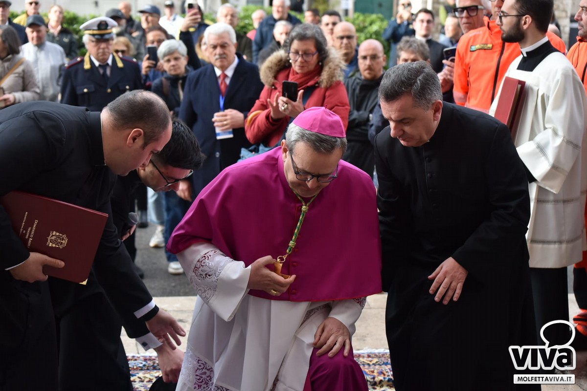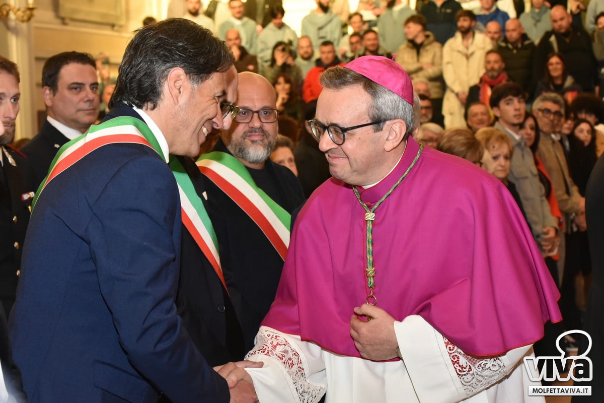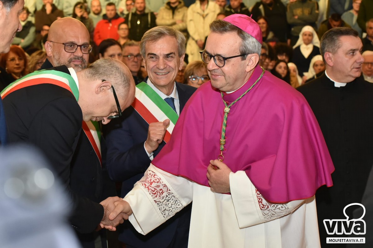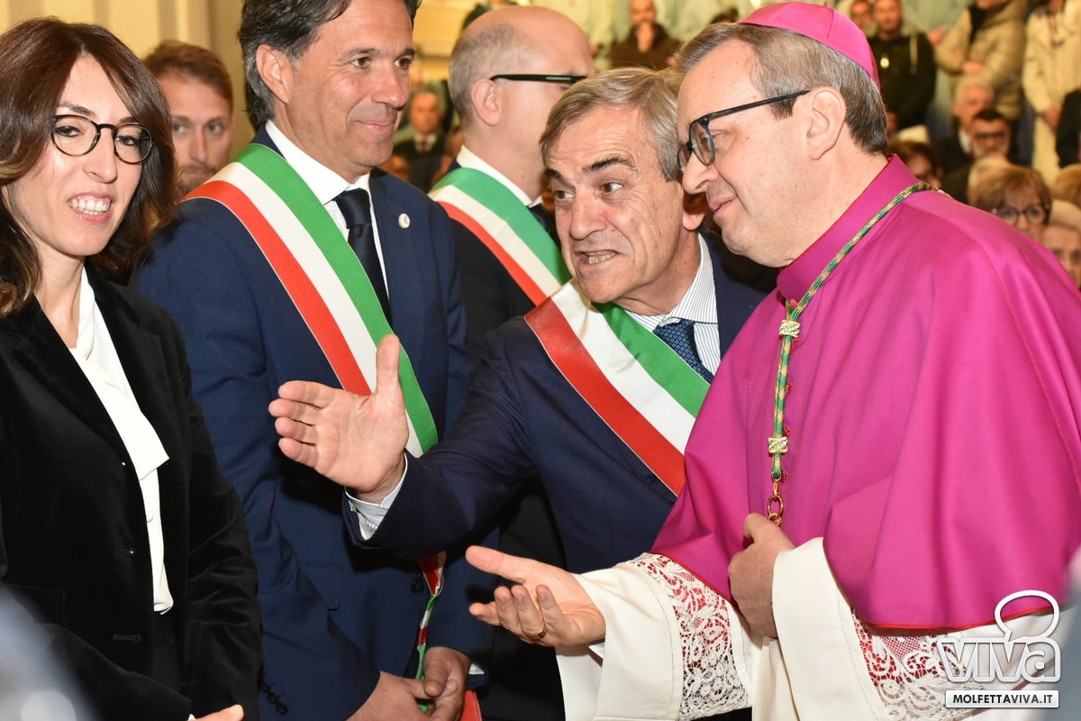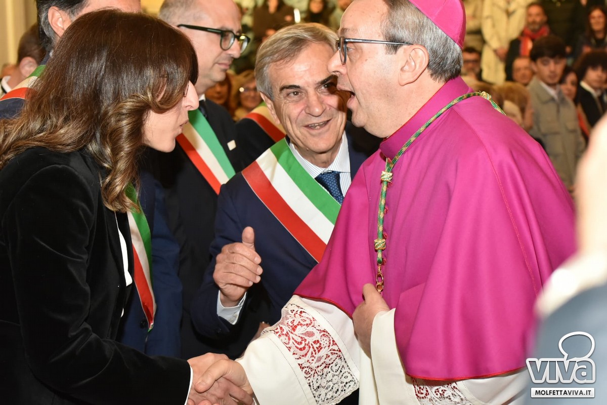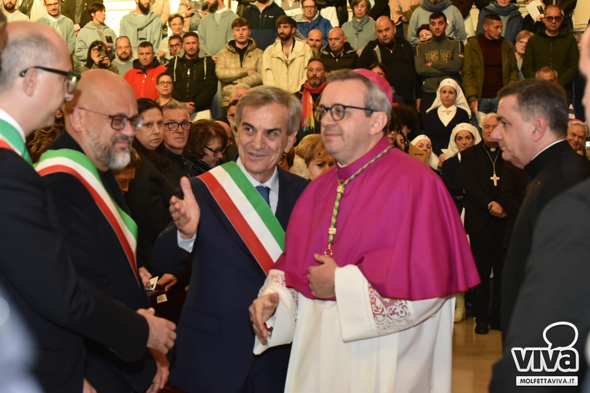 Il pomeriggio ha avuto il suo prologo nel dialogo con le autorità civili e militari nella Cattedrale di Molfetta. Mons. Basile ha esordito manifestando il desiderio di conoscere la sua nuova terra con empatia: «Il mio sguardo su questa terra desidera essere contemplativo, capace di scorgere quel desiderio di bene, verità e giustizia che risiede nel cuore di ognuno». Un passaggio che ha segnato immediatamente la cifra del suo mandato: non "fabbricare" una presenza, ma svelare Dio laddove Egli già abita.