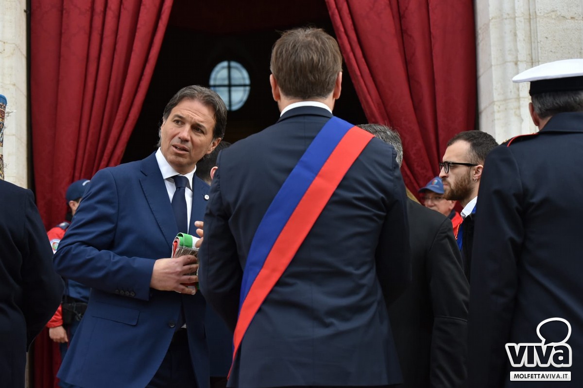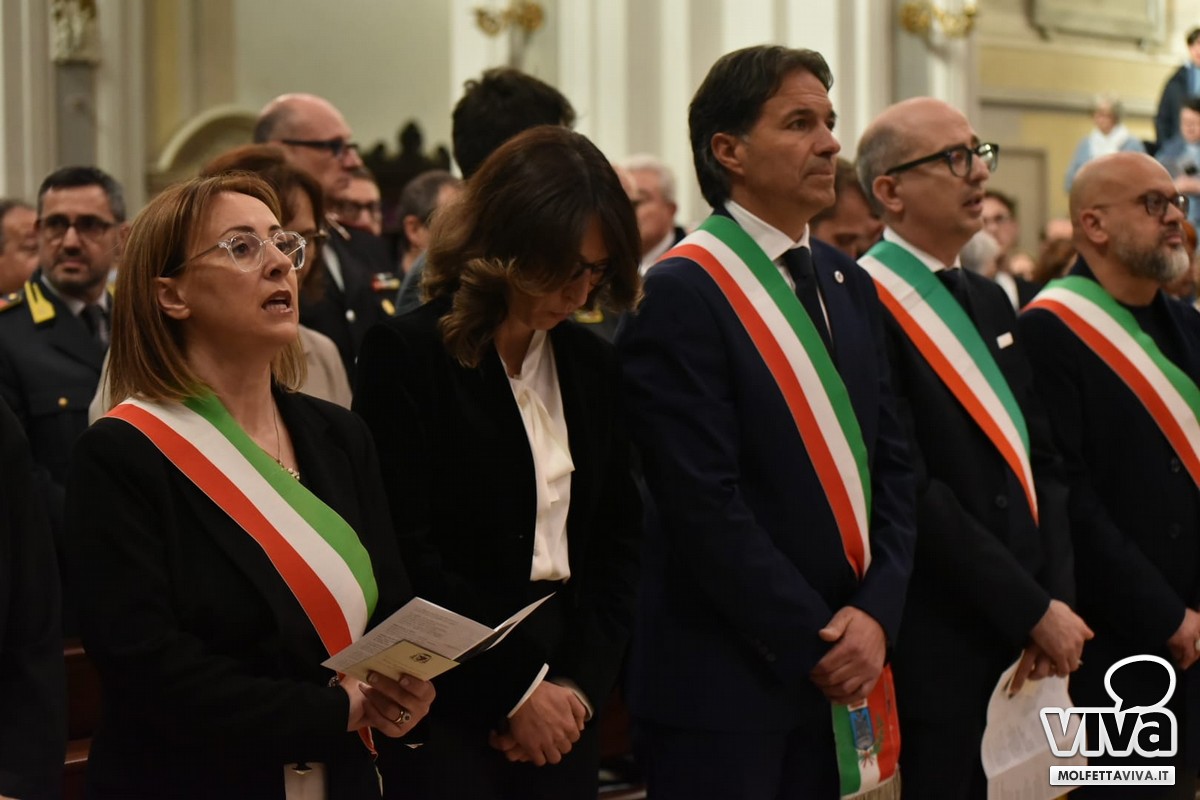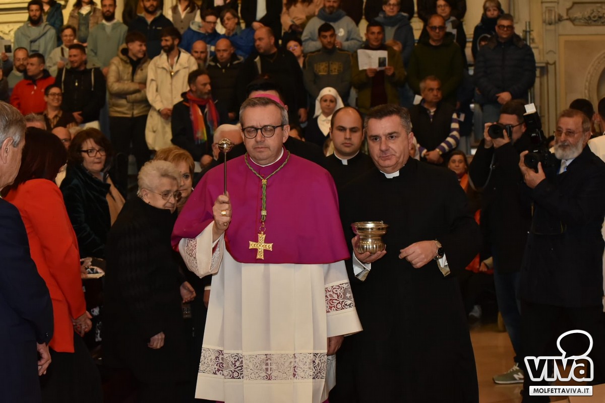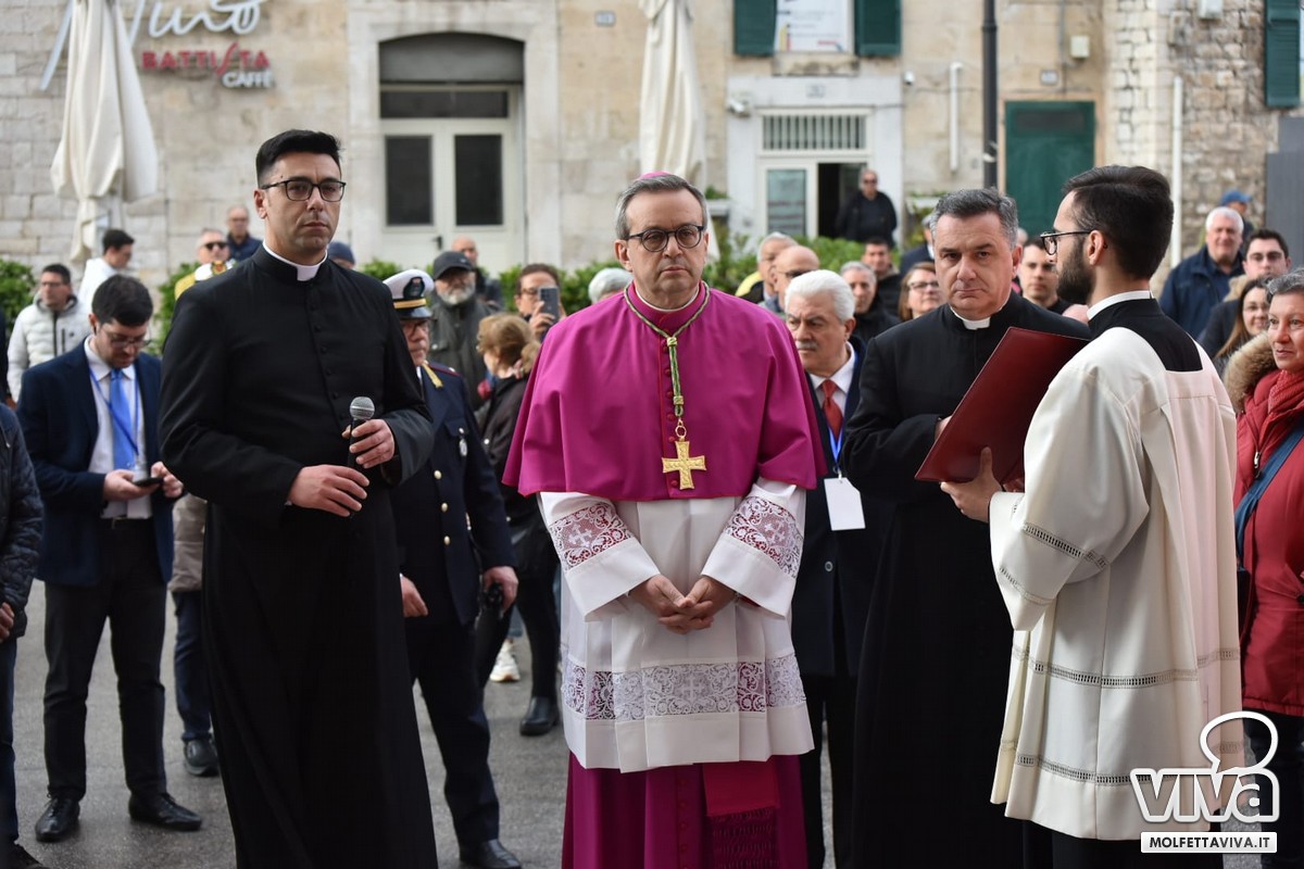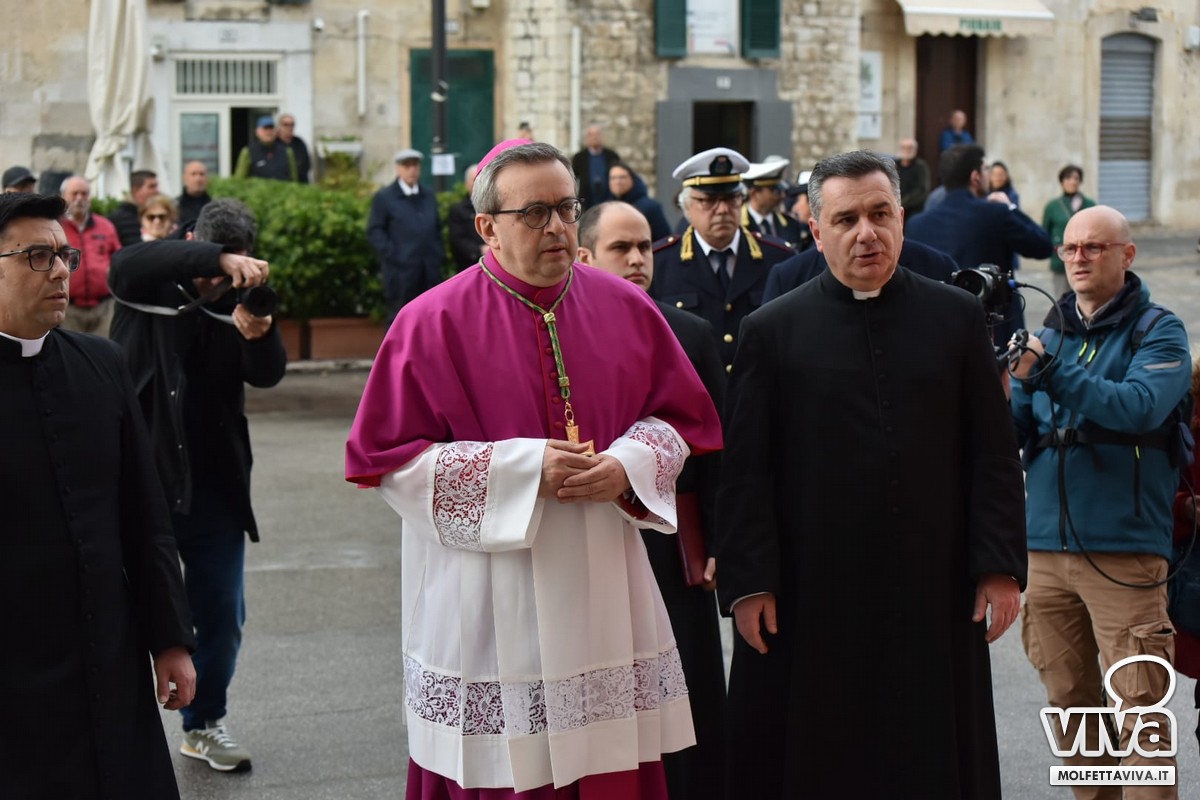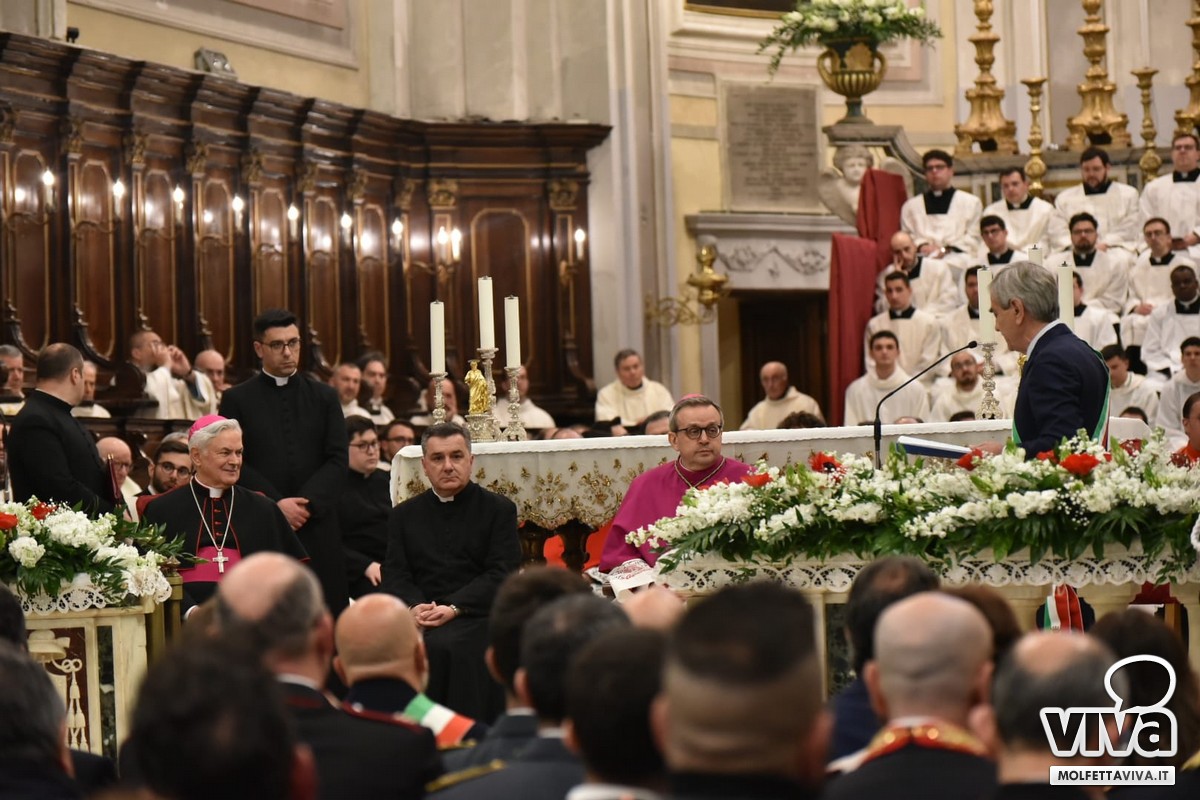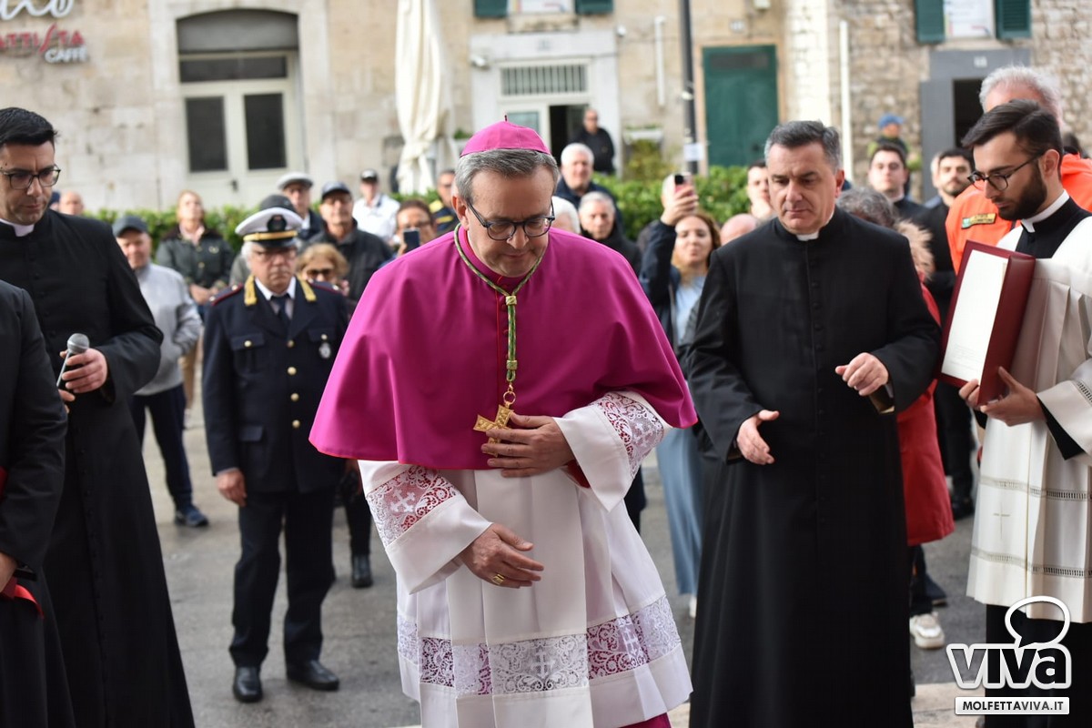 Il pomeriggio ha avuto il suo prologo nel dialogo con le autorità civili e militari nella Cattedrale di Molfetta. Mons. Basile ha esordito manifestando il desiderio di conoscere la sua nuova terra con empatia: «Il mio sguardo su questa terra desidera essere contemplativo, capace di scorgere quel desiderio di bene, verità e giustizia che risiede nel cuore di ognuno». Un passaggio che ha segnato immediatamente la cifra del suo mandato: non "fabbricare" una presenza, ma svelare Dio laddove Egli già abita.