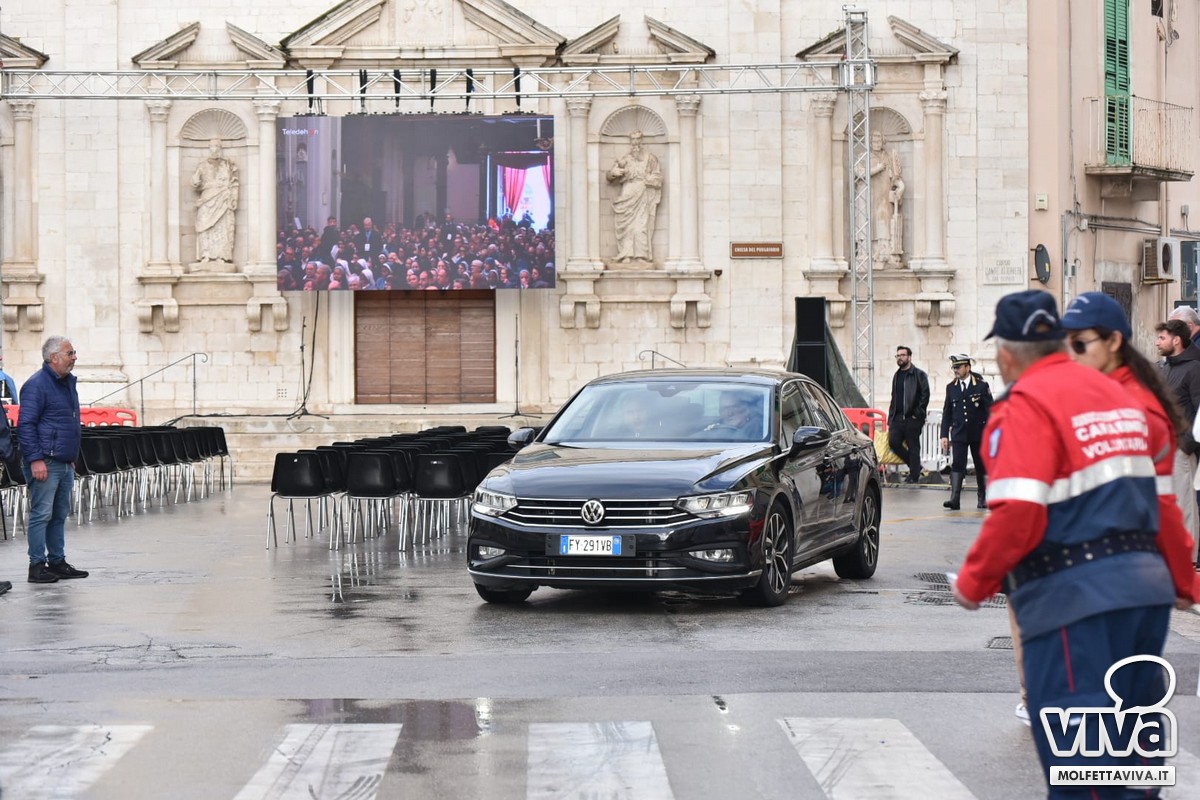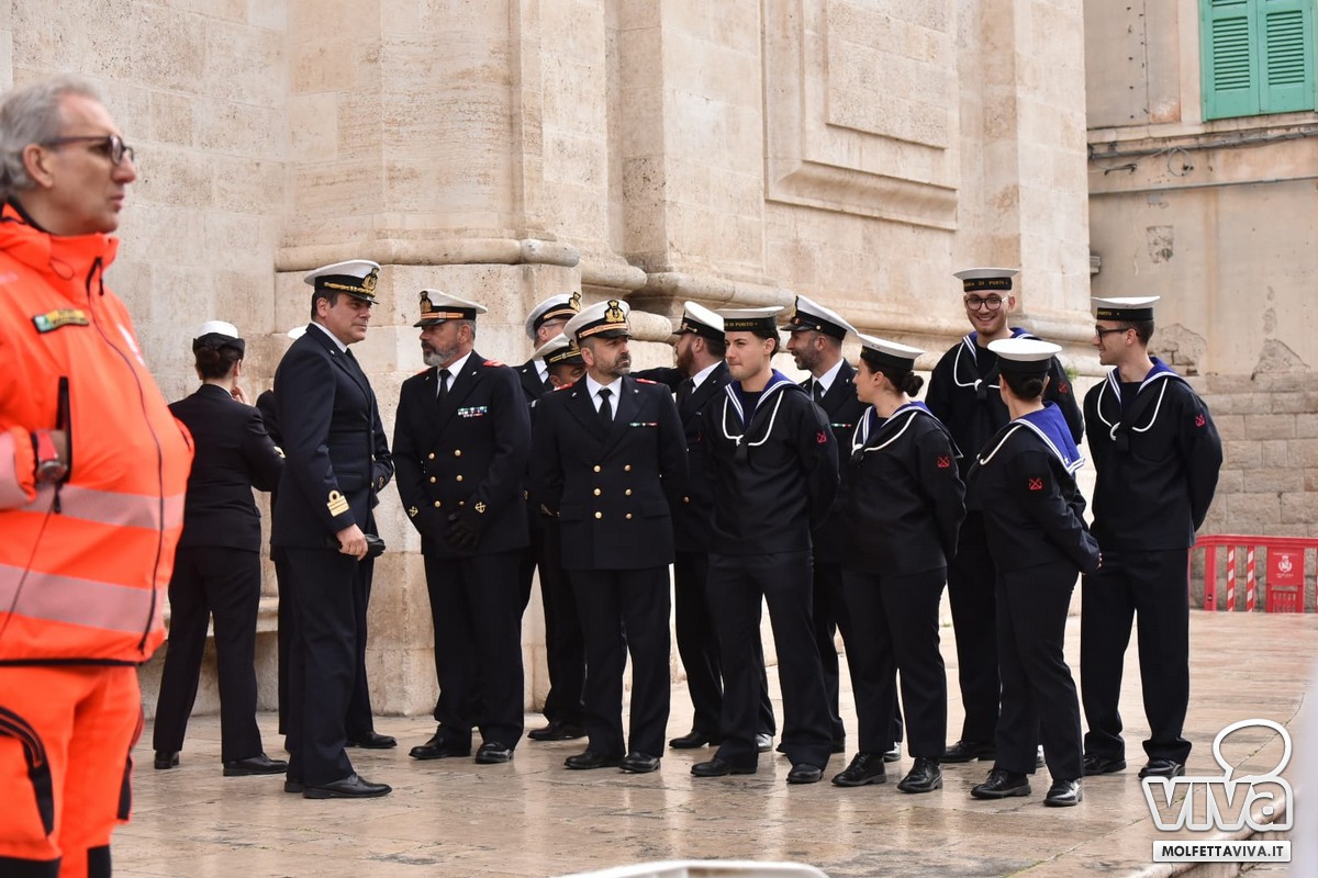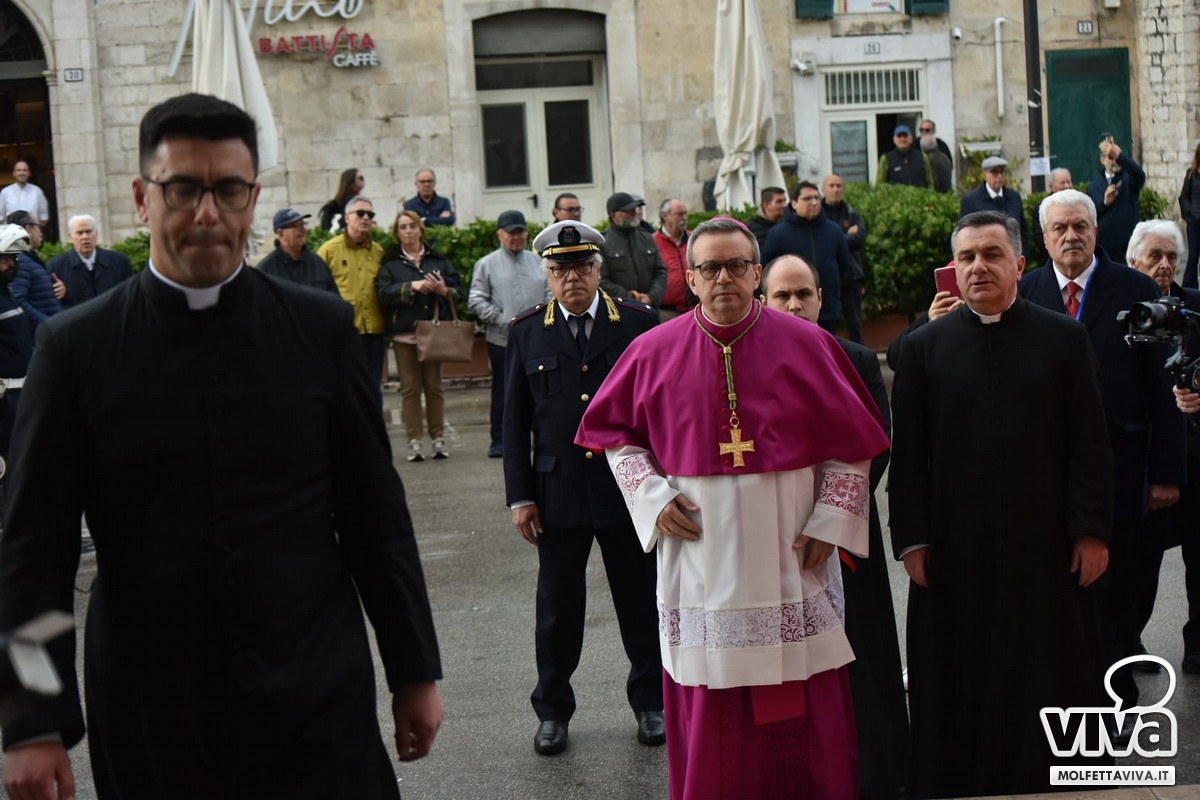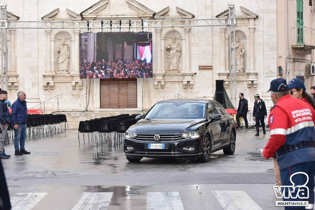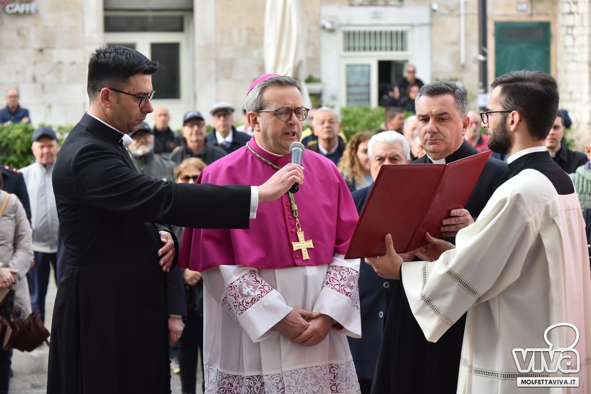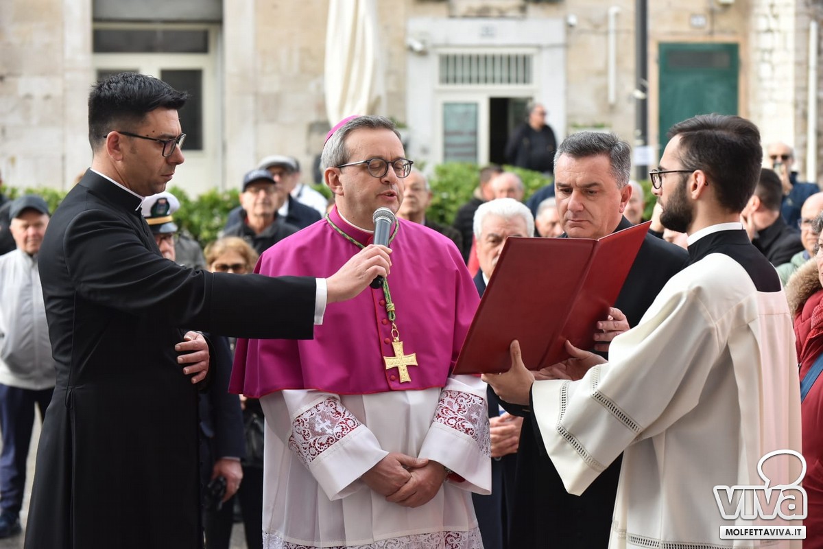 Il pomeriggio ha avuto il suo prologo nel dialogo con le autorità civili e militari nella Cattedrale di Molfetta. Mons. Basile ha esordito manifestando il desiderio di conoscere la sua nuova terra con empatia: «Il mio sguardo su questa terra desidera essere contemplativo, capace di scorgere quel desiderio di bene, verità e giustizia che risiede nel cuore di ognuno». Un passaggio che ha segnato immediatamente la cifra del suo mandato: non "fabbricare" una presenza, ma svelare Dio laddove Egli già abita.