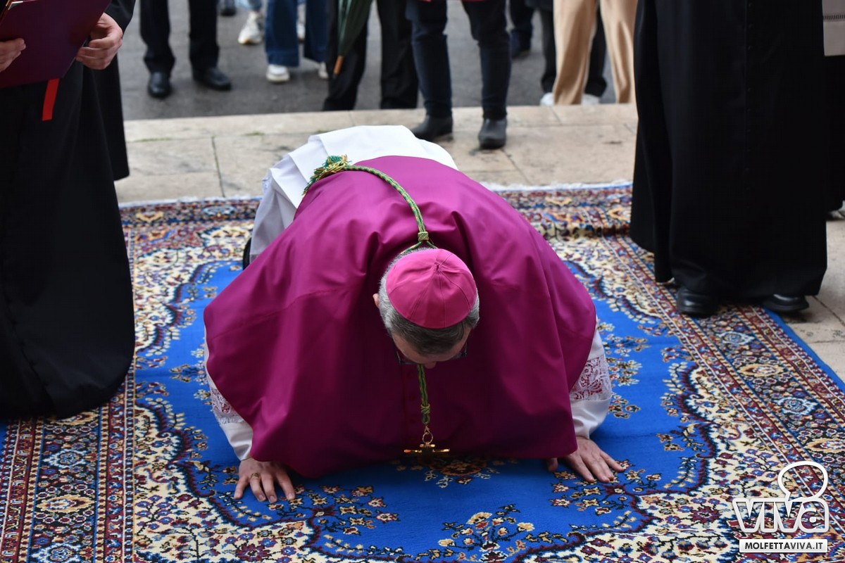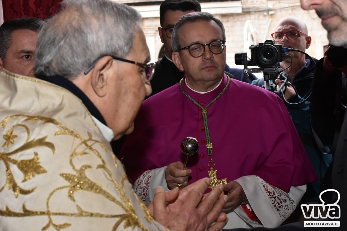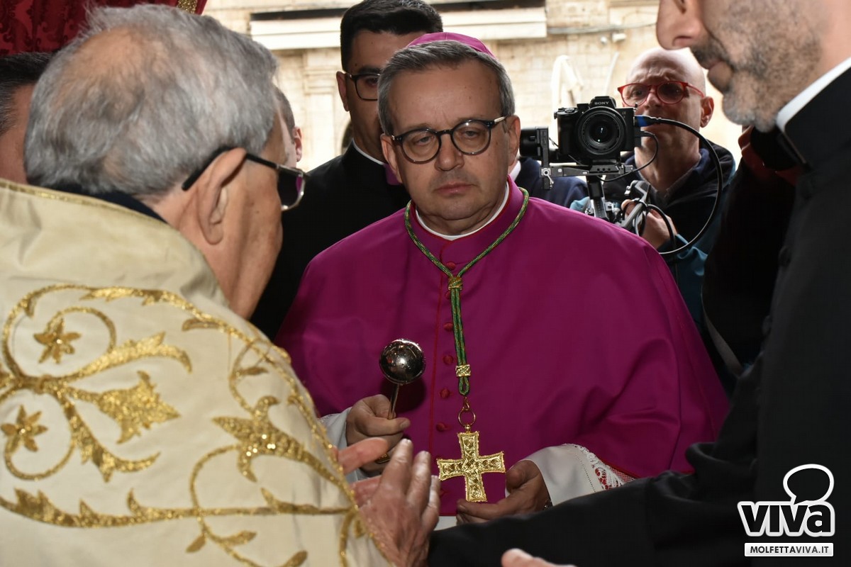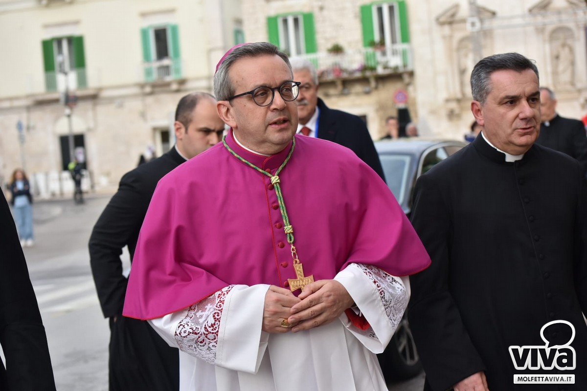 Si è aperta ieri, mercoledì 22 aprile 2026, una nuova pagina per la diocesi di Molfetta-Ruvo-Giovinazzo-Terlizzi. Con una celebrazione solenne e vissuta in un clima di profonda partecipazione, S.E. Mons. Domenico Basile ha iniziato ufficialmente il suo ministero episcopale. È stato un momento di autentica accoglienza, in cui il cammino quotidiano delle città e la preghiera solenne della comunità si sono stretti attorno alla figura del nuovo Vescovo.