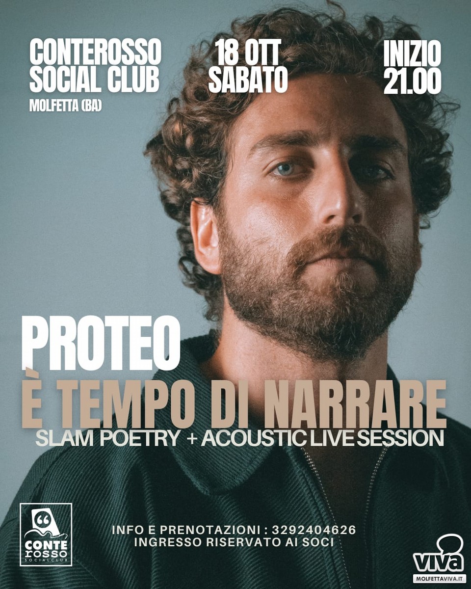 Questa sera il Conterosso Social Club di Molfetta ospita un evento speciale che unisce musica, poesia e performance dal vivo. Nicolò Ayroldi, in arte Proteo, porta sul palco il suo primo EP in forma acustica con un progetto dal titolo "È Tempo di Narrare", accompagnato da Gaetano Camporeale alle tastiere e Armando Resta alle percussioni.