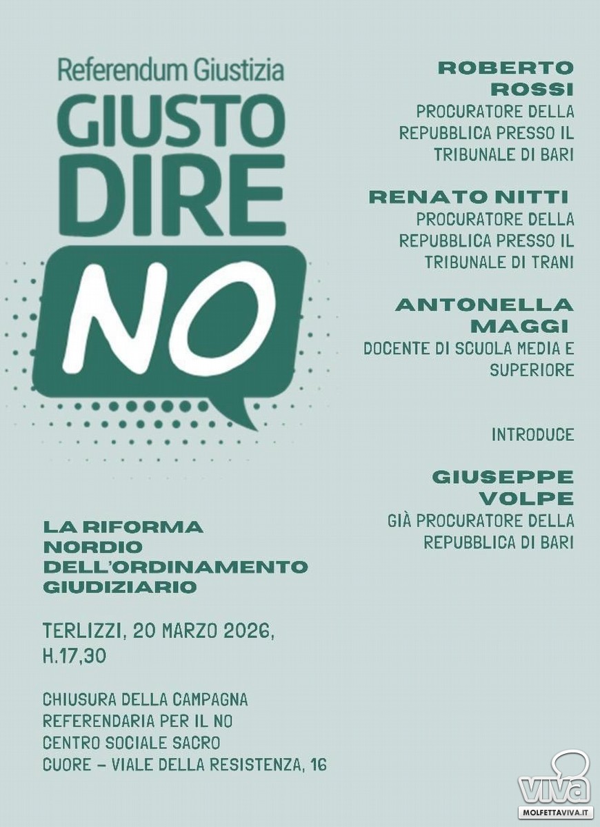 In occasione del Referendum sulla Giustizia, si terrà a Terlizzi un incontro pubblico dedicato alle ragioni del "No". L'appuntamento è previsto per il 20 marzo alle ore 17:30, presso il Centro Sociale Sacro Cuore, in Viale della Resistenza 16.