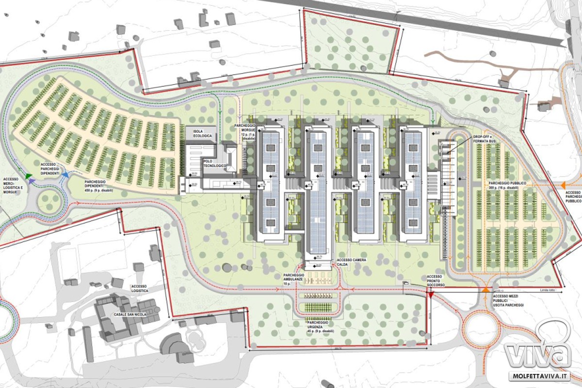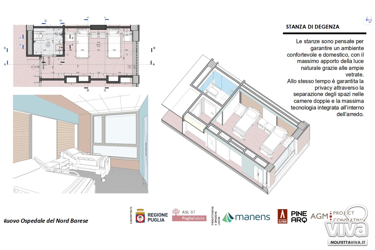 Spazi ampi e luminosi, con accesso ravvicinato alla SS16bis, in una zona a cavallo tra le province di Barletta-Andria-Trani e di Bari, in territorio di Bisceglie ma a pochi chilometri da Molfetta. Sarà un ospedale che non si limiterà a recuperare l'attuale offerta sanitaria ma la rafforzerà in un'ottica di potenziamento e miglioramento, con elementi d'avanguardia e un'architettura che sposa il territorio, in una alternanza tra reparti, corridoi e spazi aperti, predisposto anche per una conversione efficace in caso di scenario pandemico. Il progetto del nuovo ospedale è stato presentato dal prof. Ing. Francesco Ruggiero in rappresentanza del Raggruppamento temporaneo composto da Manens, Studio Altieri, Pinearq, AGM Project Consulting.