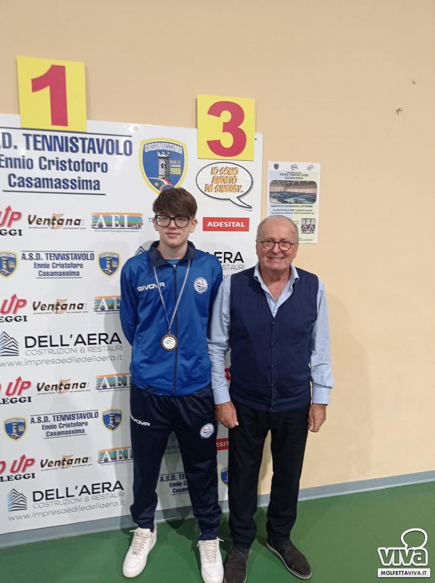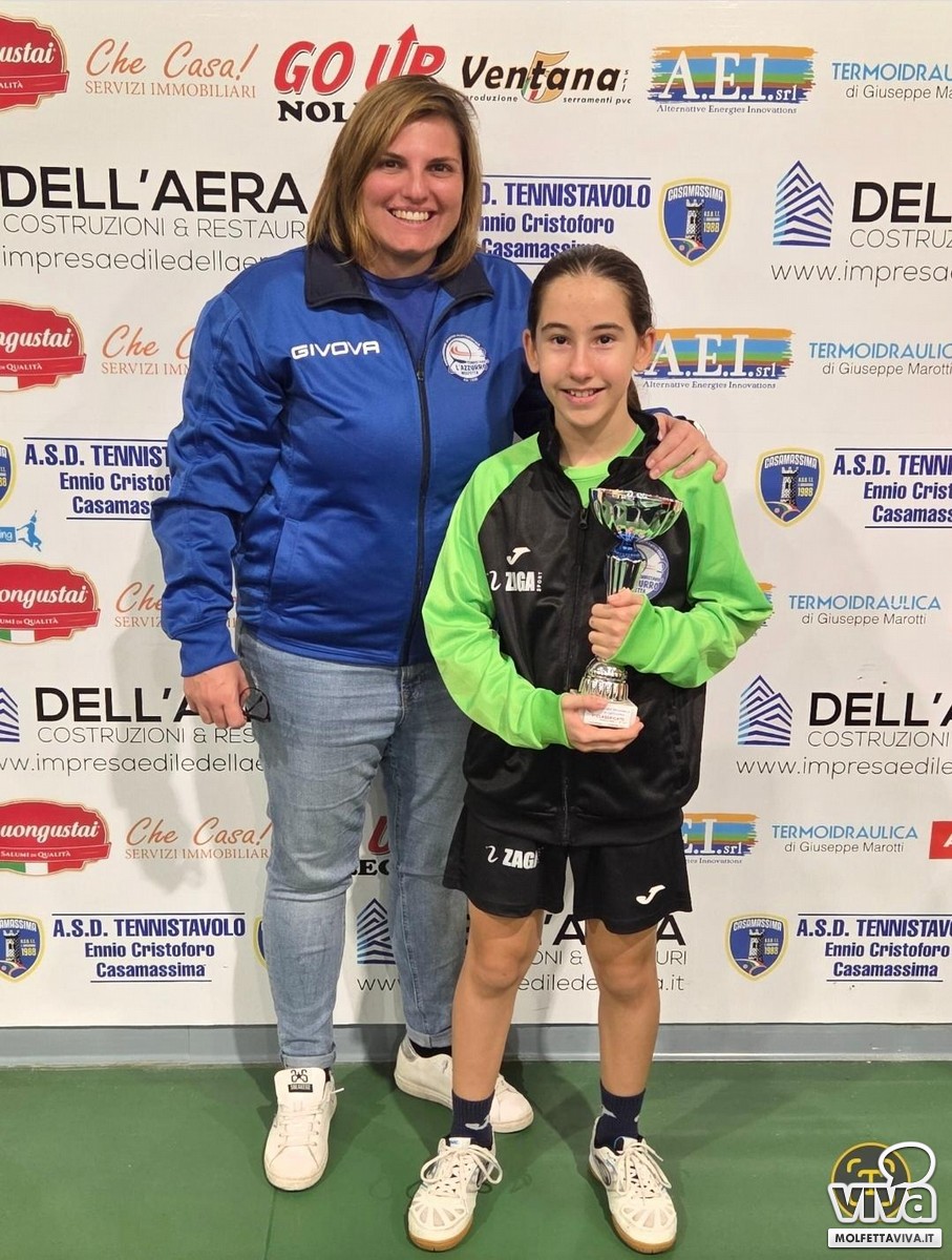 L'ASD Tennistavolo L'Azzurro Molfetta festeggia due eccellenti risultati al Torneo Regionale di Categoria Maschile e Femminile, che si è svolto a Casamassima nei giorni 1 e 2 novembre 2025. Durante le gare del sabato pomeriggio, Giovine Melissa determinata e concentrata, ha conquistato il primo posto nel torneo di 5^categoria femminile, superando tutte le avversarie e confermando così la sua tenacia e il suo impegno nella disciplina del tennistavolo.